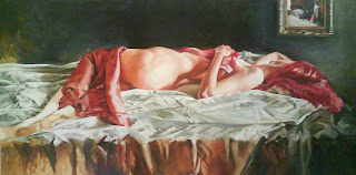 The painting requires a little more work on the fabric and the progress of that is throwing into perspective the inadequacy of the rest of the work. I also need to talk to the model more, I miss her whilst painting it (she is living in Canada and the work is being finished from photos).